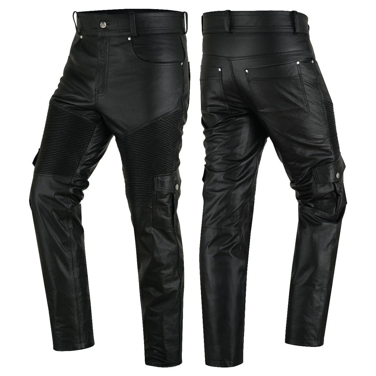 Men's Motorcycle Cowhide Leather Pants Biker Leather Pants 6 Pocket Cargo Biker Trousers