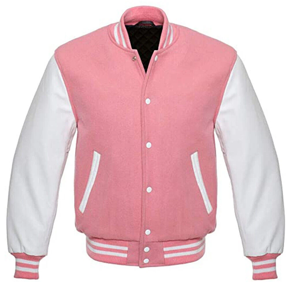 Baseball Winter Jacket College Bomber Jacket Pink Wool & White Leather Sleeves