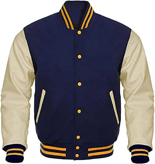 Letterman Jacket Varsity Bomber Baseball Jacket Navy Wool & Cream Leather Sleeves