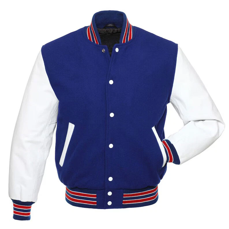 Baseball College Varsity Bomber Letterman White Wool & Leather Sleeves Jacket